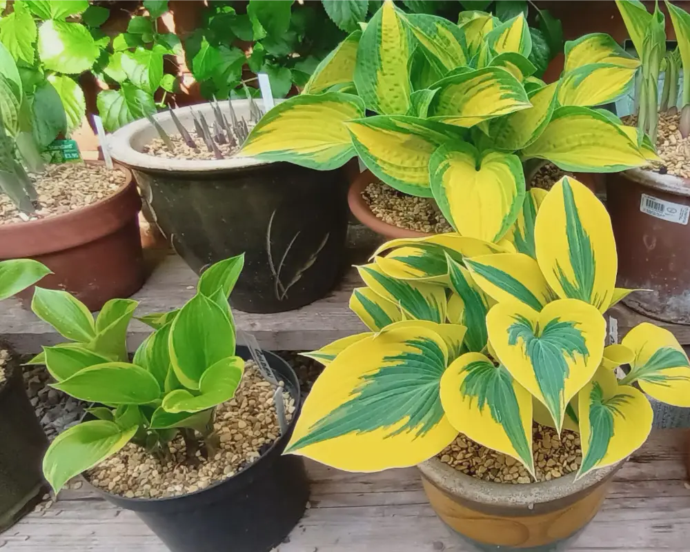 Now for the SOIL. Hostas need high fertility, preferably slightly acidic.   They are greedy plants, and the bigger the plant the greater the need for good quality soil.  Mix our heavy clay with garden compost/farmyard compost/spent mushroom compost/horticultural grit/vermiculite/perlite, all  to improve drainage, open the soil, and form sponge-like crumbs to retain moisture. Add a tablespoon of bone meal.  Mix.  Place a few handfuls of new soil in the bottom, replace the plant, top up with soil forcing it down the sides of the pot to remove air. Leave space at the top for watering.  Water and label.   Add fresh decorative gravel when the level of the pot has fully settled.